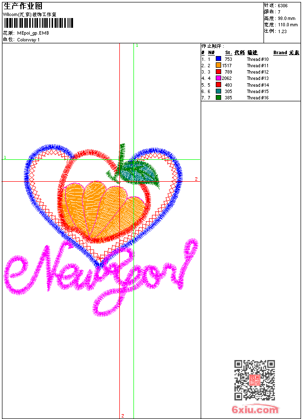 - emb花版参数: 大小:40.50 KB / 尺寸:110*98[毫米] / 针数:6306针 / 线色:7 / 格式:emb / 版本:9