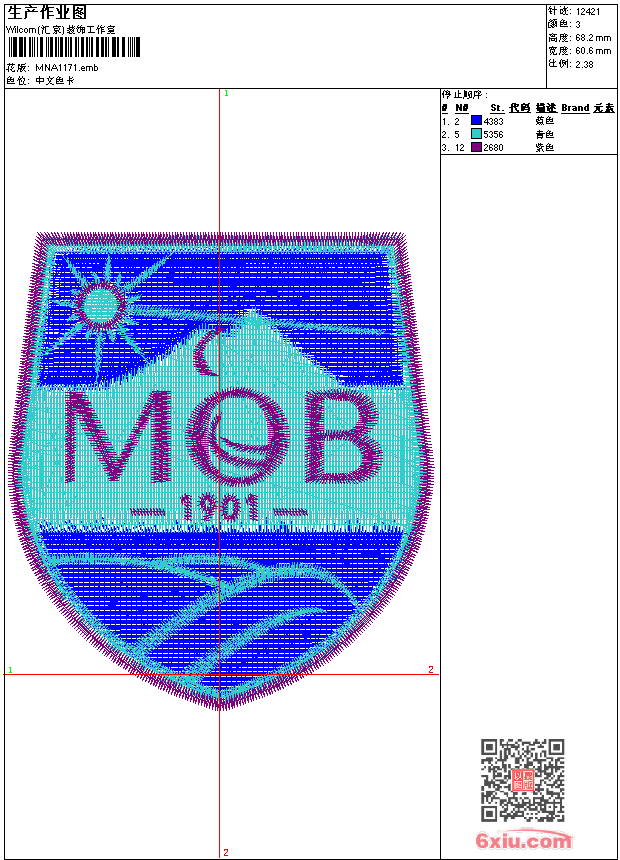 - emb花版参数: 大小:47.50 KB / 尺寸:61*68[毫米] / 针数:12421针 / 线色:3 / 格式:emb / 版本:9