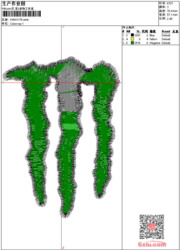 - emb花版参数: 大小:44.50 KB / 尺寸:57*78[毫米] / 针数:6727针 / 线色:3 / 格式:emb / 版本:9