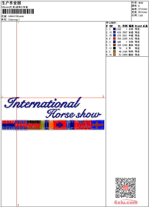 - emb花版参数: 大小:50.00 KB / 尺寸:85*28[毫米] / 针数:4642针 / 线色:8 / 格式:emb / 版本:9