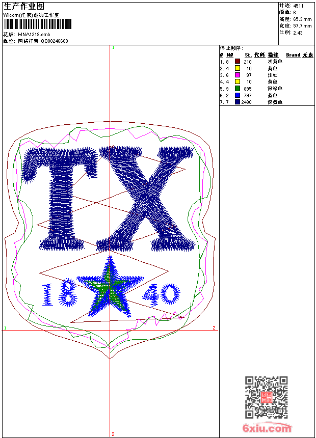 - emb花版参数: 大小:46.50 KB / 尺寸:58*65[毫米] / 针数:4511针 / 线色:6 / 格式:emb / 版本:9
