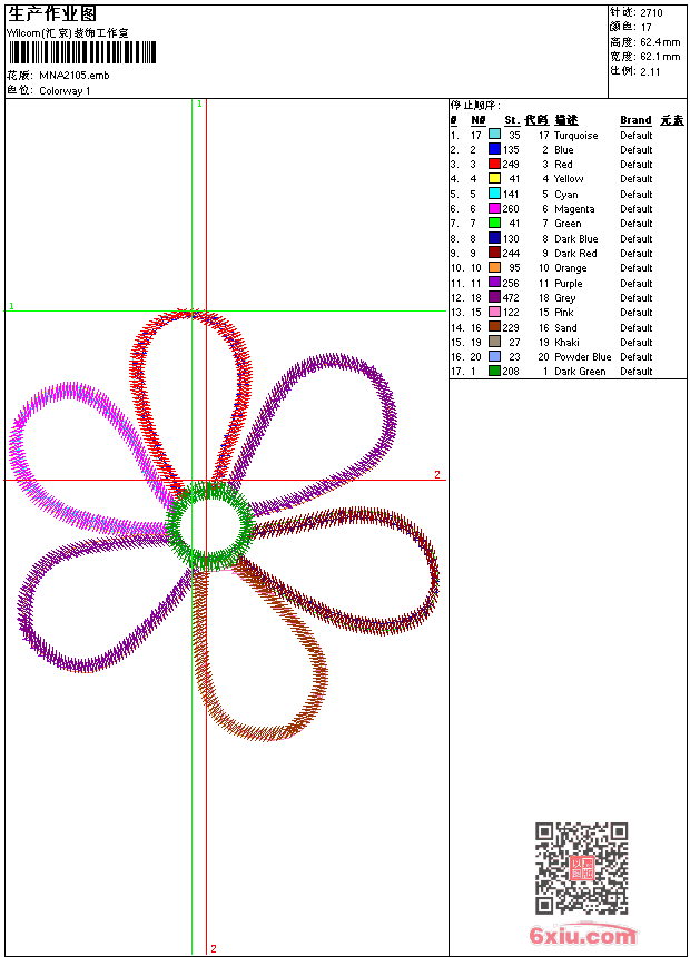 - emb花版参数: 大小:37.00 KB / 尺寸:62*62[毫米] / 针数:2710针 / 线色:17 / 格式:emb / 版本:9