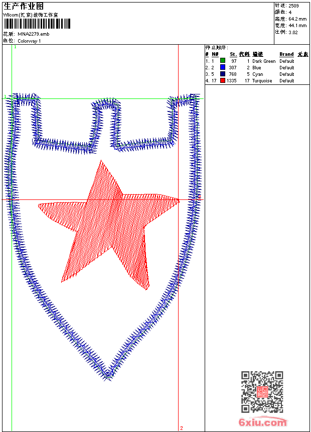 - emb花版参数: 大小:27.00 KB / 尺寸:44*64[毫米] / 针数:2509针 / 线色:4 / 格式:emb / 版本:9