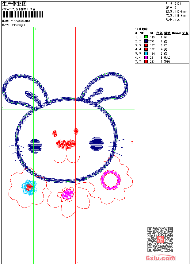 - emb花版参数: 大小:43.00 KB / 尺寸:117*130[毫米] / 针数:3101针 / 线色:7 / 格式:emb / 版本:9