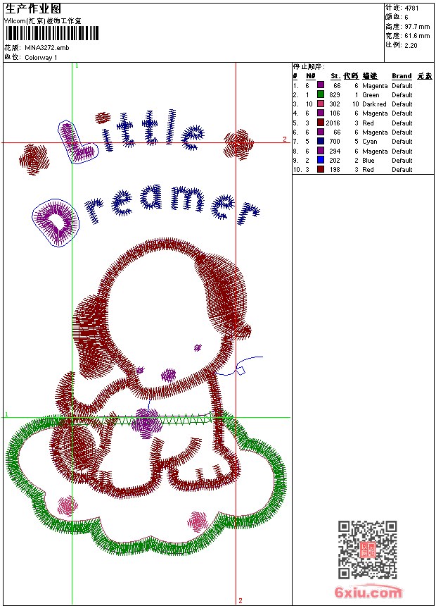 - emb花版参数: 大小:64.50 KB / 尺寸:62*98[毫米] / 针数:4781针 / 线色:6 / 格式:emb / 版本:9