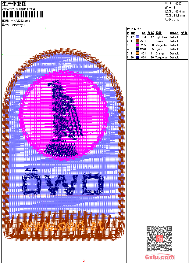 - emb花版参数: 大小:54.50 KB / 尺寸:64*100[毫米] / 针数:14707针 / 线色:6 / 格式:emb / 版本:9