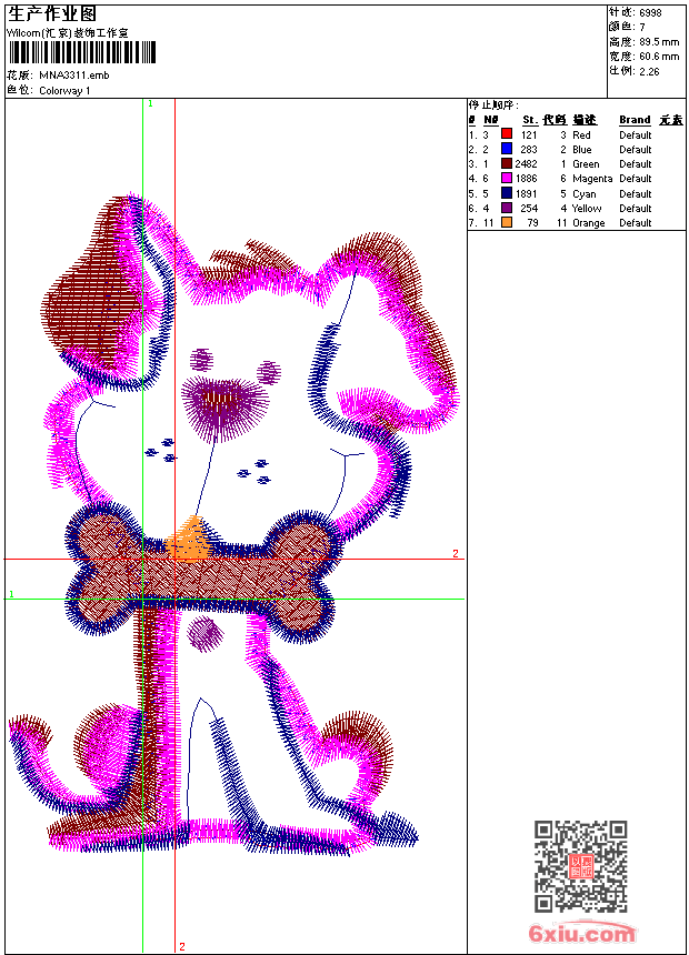 - emb花版参数: 大小:61.50 KB / 尺寸:61*90[毫米] / 针数:6998针 / 线色:7 / 格式:emb / 版本:9