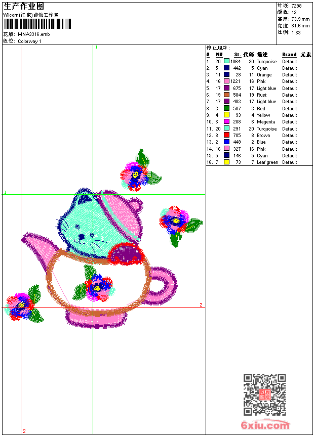 - emb花版参数: 大小:77.00 KB / 尺寸:82*74[毫米] / 针数:7298针 / 线色:12 / 格式:emb / 版本:9