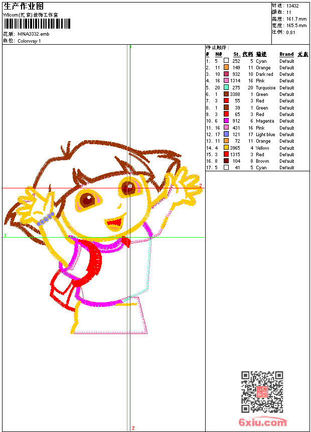 - emb花版参数: 大小:116.00 KB / 尺寸:166*162[毫米] / 针数:13432针 / 线色:11 / 格式:emb / 版本:9