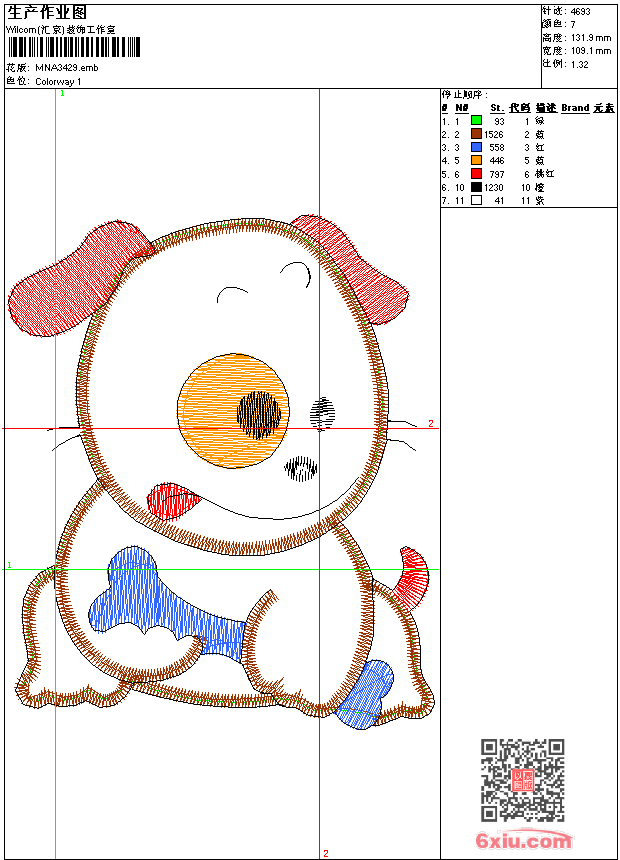- emb花版参数: 大小:50.00 KB / 尺寸:109*132[毫米] / 针数:4693针 / 线色:7 / 格式:emb / 版本:9