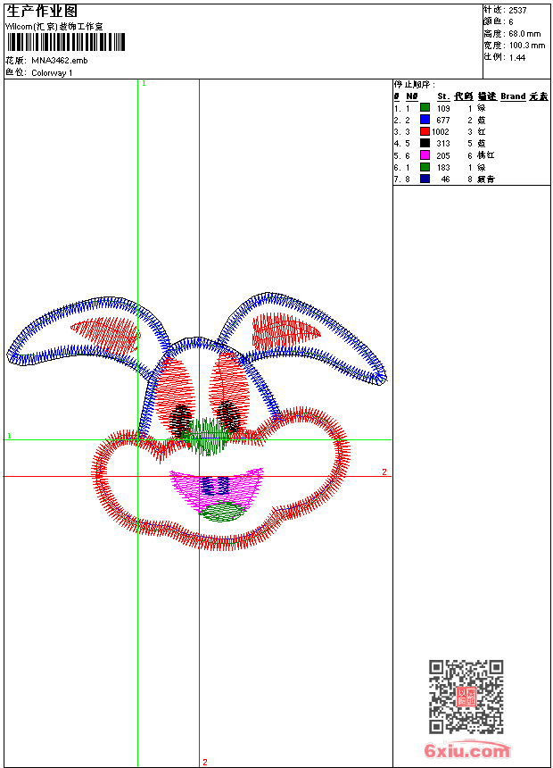 - emb花版参数: 大小:38.50 KB / 尺寸:100*68[毫米] / 针数:2537针 / 线色:6 / 格式:emb / 版本:9