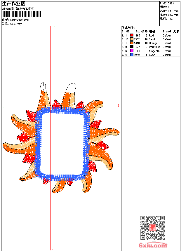 - emb花版参数: 大小:45.00 KB / 尺寸:89*85[毫米] / 针数:5493针 / 线色:6 / 格式:emb / 版本:9