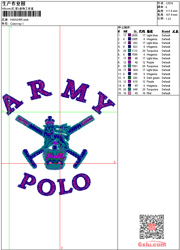 - emb花版参数: 大小:110.50 KB / 尺寸:108*112[毫米] / 针数:13579针 / 线色:6 / 格式:emb / 版本:9