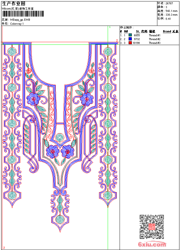 - emb花版参数: 大小:50.50 KB / 尺寸:330*543[毫米] / 针数:26787针 / 线色:3 / 格式:emb / 版本:9