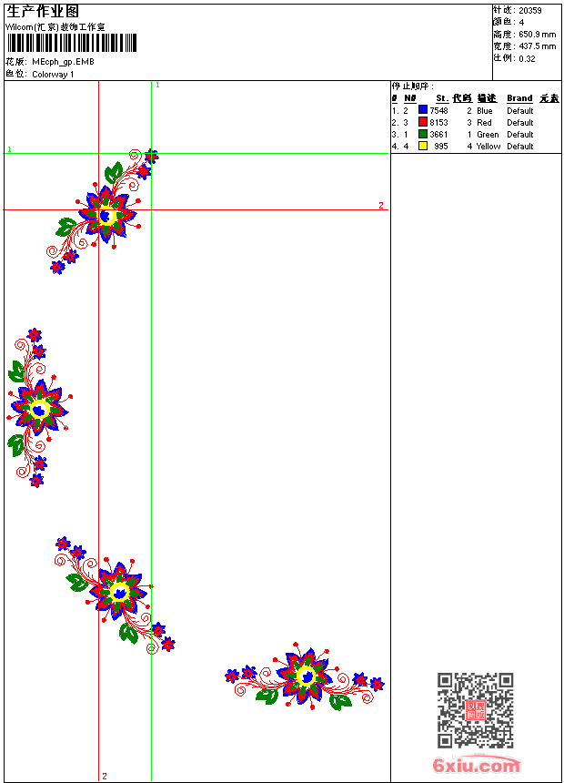 - emb花版参数: 大小:138.50 KB / 尺寸:437*651[毫米] / 针数:20359针 / 线色:4 / 格式:emb / 版本:9