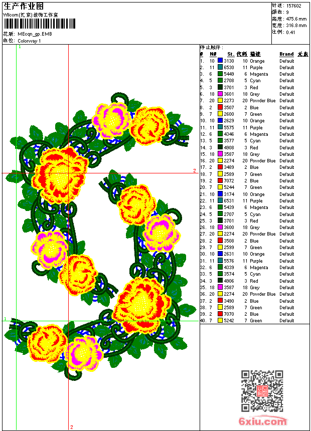 - emb花版参数: 大小:1.08 MB / 尺寸:317*476[毫米] / 针数:157602针 / 线色:9 / 格式:emb / 版本:9