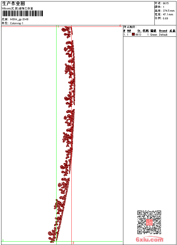 - emb花版参数: 大小:29.00 KB / 尺寸:47*375[毫米] / 针数:8615针 / 线色:1 / 格式:emb / 版本:9