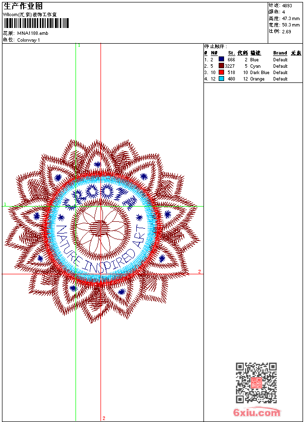 - emb花版参数: 大小:49.00 KB / 尺寸:50*47[毫米] / 针数:4893针 / 线色:4 / 格式:emb / 版本:9