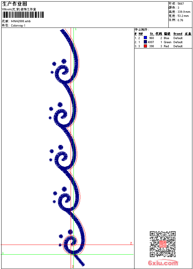 - emb花版参数: 大小:41.50 KB / 尺寸:53*340[毫米] / 针数:5667针 / 线色:3 / 格式:emb / 版本:9