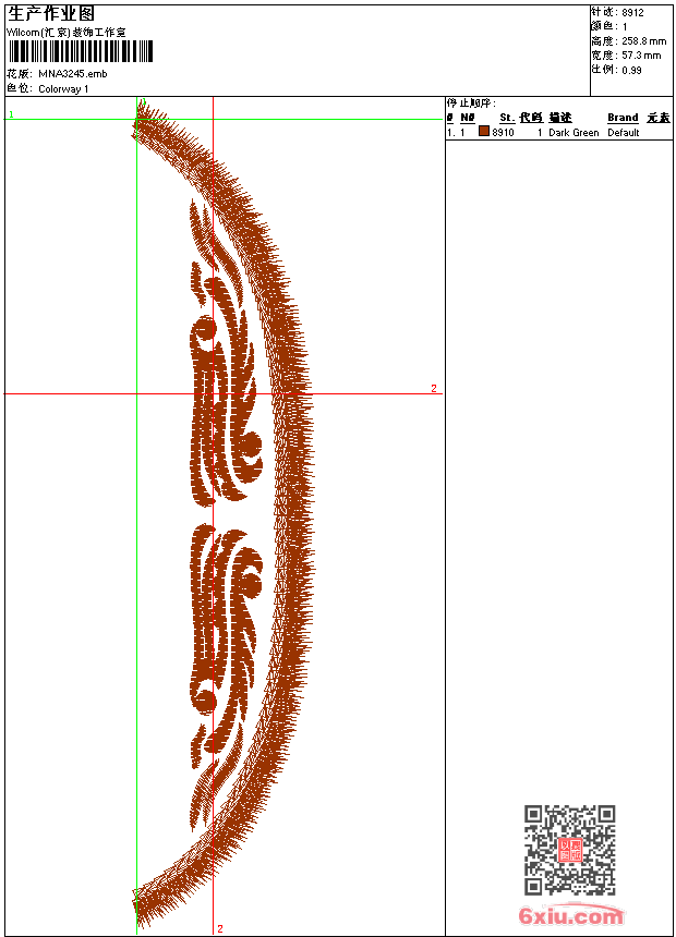 - emb花版参数: 大小:67.00 KB / 尺寸:57*259[毫米] / 针数:8912针 / 线色:1 / 格式:emb / 版本:9