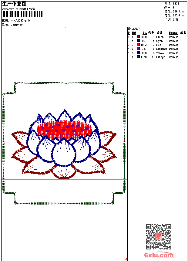 - emb花版参数: 大小:60.00 KB / 尺寸:237*236[毫米] / 针数:8931针 / 线色:6 / 格式:emb / 版本:9