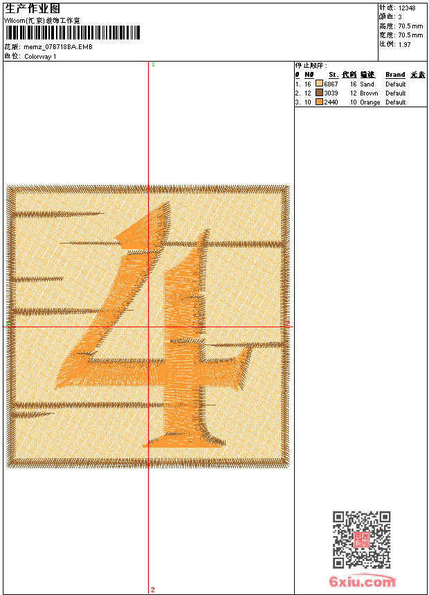 - emb花版参数: 大小:376.00 KB / 尺寸:71*70[毫米] / 针数:12350针 / 线色:3 / 格式:emb / 版本:9
