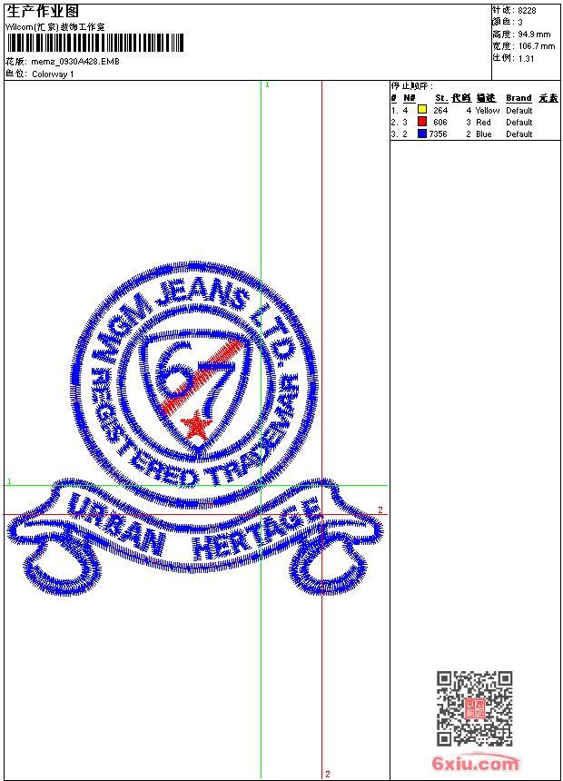 - emb花版参数: 大小:80.00 KB / 尺寸:107*95[毫米] / 针数:8228针 / 线色:3 / 格式:emb / 版本:9