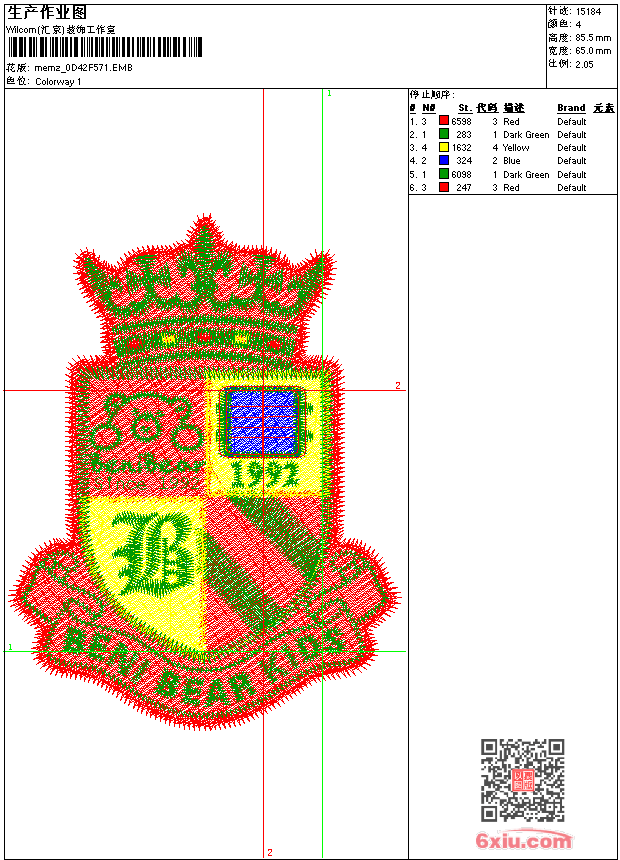 - emb花版参数: 大小:85.00 KB / 尺寸:65*85[毫米] / 针数:15184针 / 线色:4 / 格式:emb / 版本:9