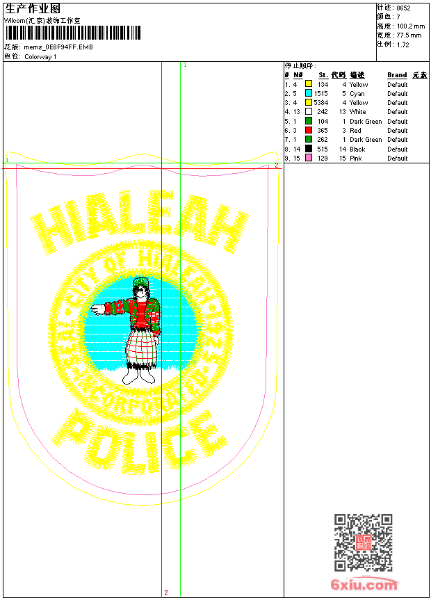 - emb花版参数: 大小:842.50 KB / 尺寸:77*100[毫米] / 针数:8652针 / 线色:7 / 格式:emb / 版本:9