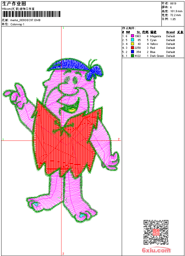 - emb花版参数: 大小:814.00 KB / 尺寸:72*102[毫米] / 针数:8819针 / 线色:6 / 格式:emb / 版本:9