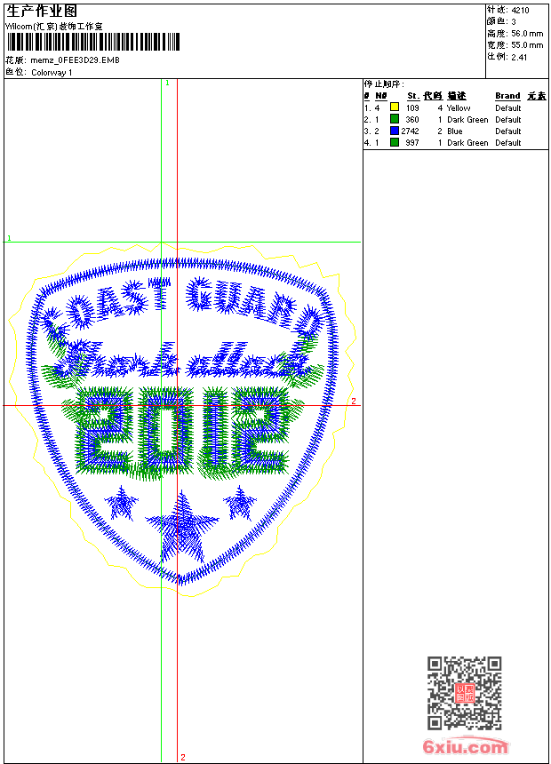 - emb花版参数: 大小:330.50 KB / 尺寸:55*56[毫米] / 针数:4210针 / 线色:3 / 格式:emb / 版本:9