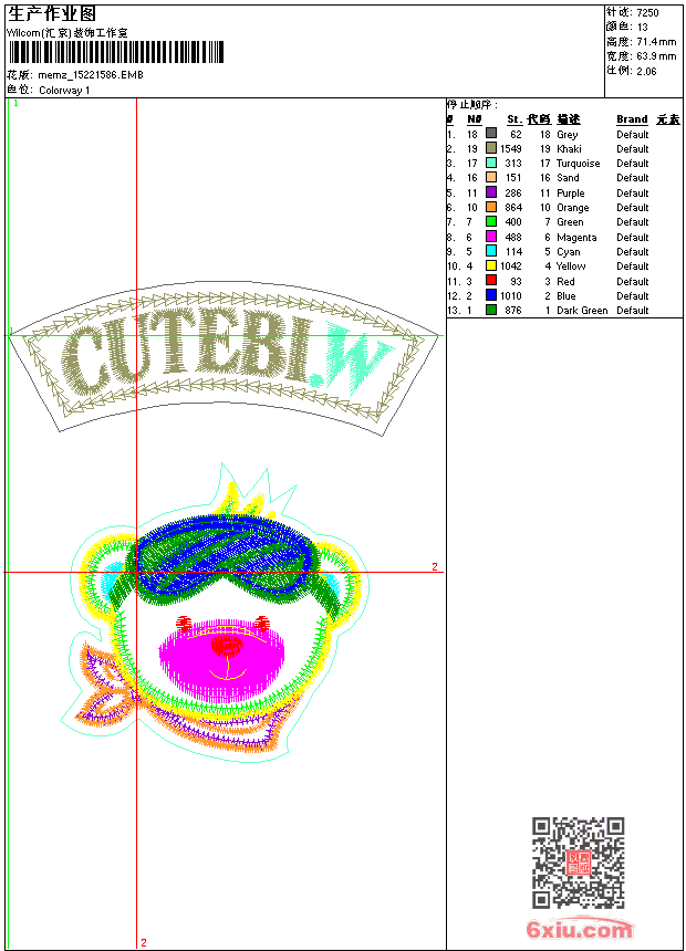 - emb花版参数: 大小:78.50 KB / 尺寸:64*71[毫米] / 针数:7250针 / 线色:13 / 格式:emb / 版本:9