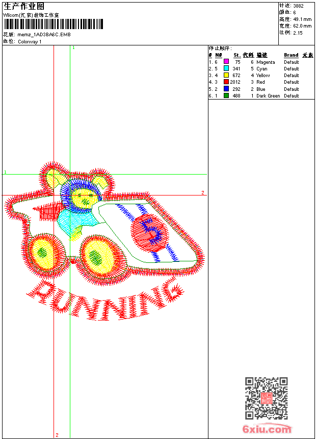 - emb花版参数: 大小:332.00 KB / 尺寸:62*49[毫米] / 针数:3882针 / 线色:6 / 格式:emb / 版本:9