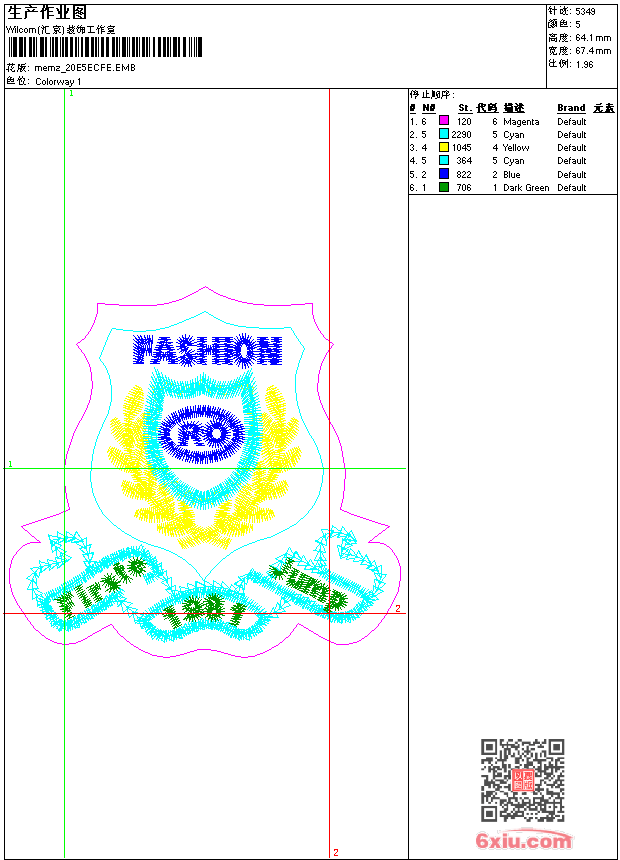 - emb花版参数: 大小:65.50 KB / 尺寸:67*64[毫米] / 针数:5349针 / 线色:5 / 格式:emb / 版本:9