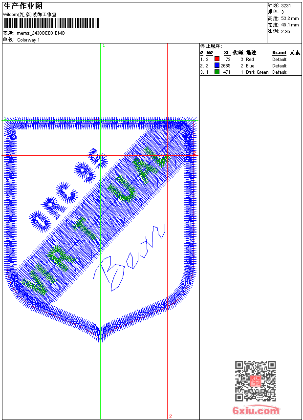 - emb花版参数: 大小:122.00 KB / 尺寸:45*53[毫米] / 针数:3231针 / 线色:3 / 格式:emb / 版本:9