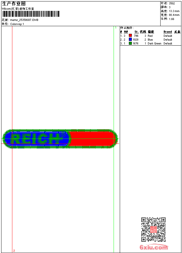 - emb花版参数: 大小:25.00 KB / 尺寸:80*13[毫米] / 针数:3502针 / 线色:3 / 格式:emb / 版本:9