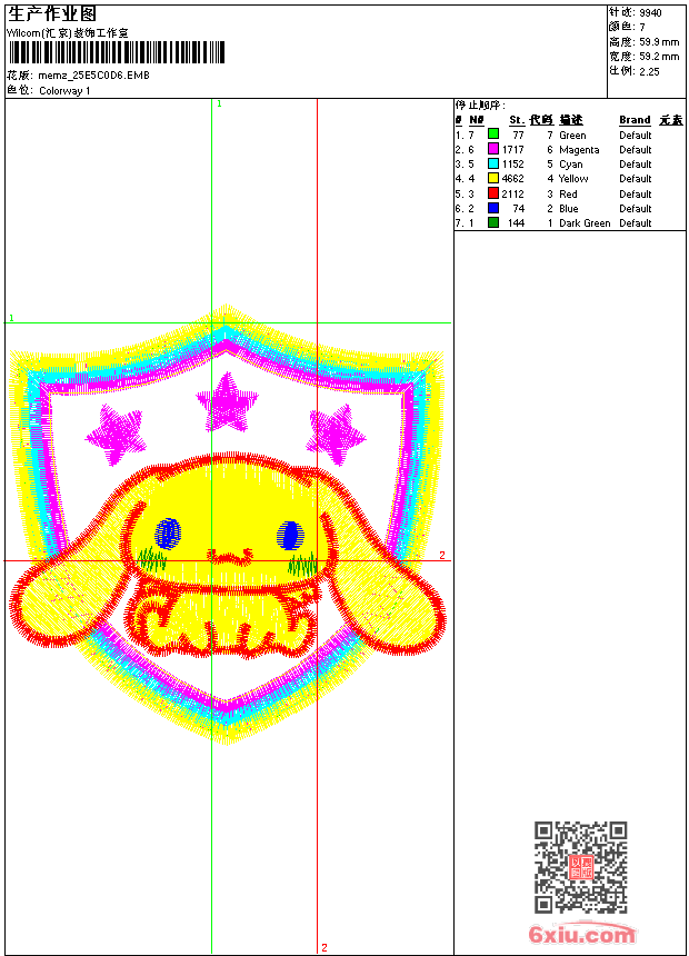 - emb花版参数: 大小:64.00 KB / 尺寸:59*60[毫米] / 针数:9940针 / 线色:7 / 格式:emb / 版本:9