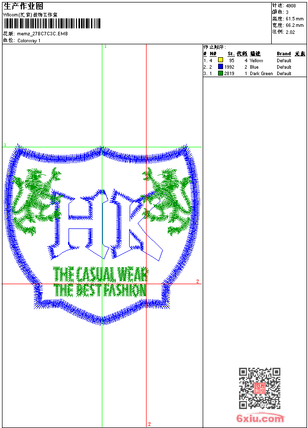 - emb花版参数: 大小:54.00 KB / 尺寸:66*62[毫米] / 针数:4908针 / 线色:3 / 格式:emb / 版本:9