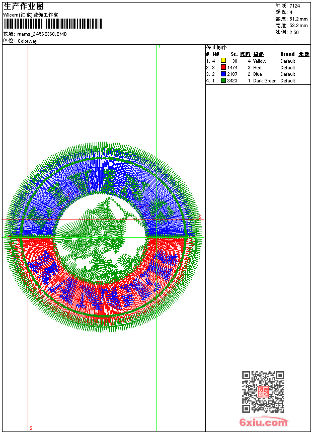 - emb花版参数: 大小:70.50 KB / 尺寸:53*51[毫米] / 针数:7124针 / 线色:4 / 格式:emb / 版本:9