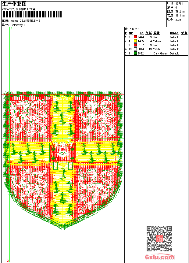 - emb花版参数: 大小:725.50 KB / 尺寸:39*56[毫米] / 针数:10784针 / 线色:4 / 格式:emb / 版本:9