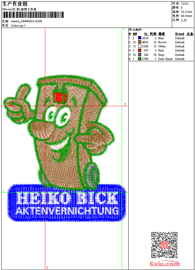 - emb花版参数: 大小:79.00 KB / 尺寸:60*72[毫米] / 针数:13321针 / 线色:6 / 格式:emb / 版本:9