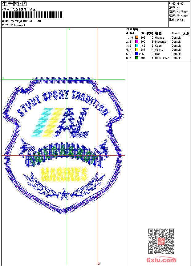 - emb花版参数: 大小:56.50 KB / 尺寸:55*61[毫米] / 针数:4402针 / 线色:6 / 格式:emb / 版本:9