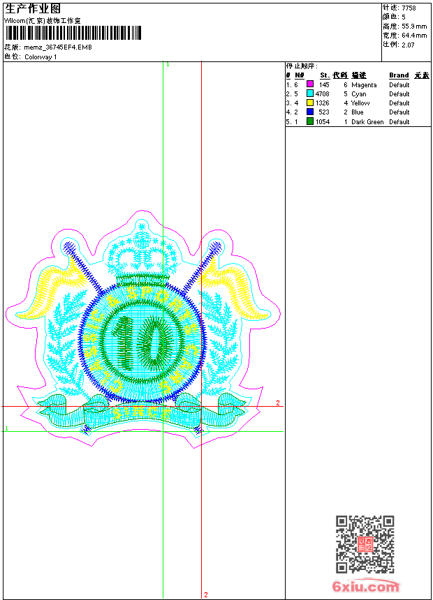 - emb花版参数: 大小:73.50 KB / 尺寸:64*56[毫米] / 针数:7758针 / 线色:5 / 格式:emb / 版本:9