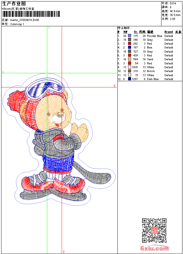 - emb花版参数: 大小:71.50 KB / 尺寸:37*43[毫米] / 针数:5374针 / 线色:8 / 格式:emb / 版本:9