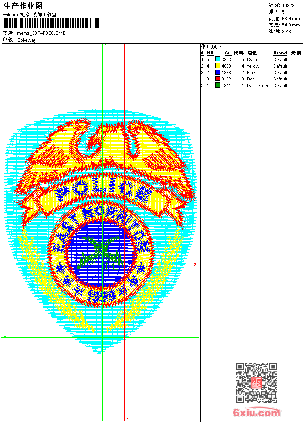 - emb花版参数: 大小:90.50 KB / 尺寸:54*69[毫米] / 针数:14229针 / 线色:5 / 格式:emb / 版本:9