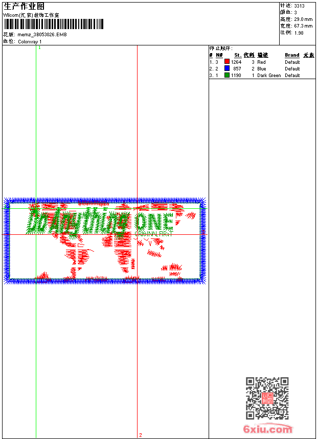 - emb花版参数: 大小:36.00 KB / 尺寸:67*29[毫米] / 针数:3313针 / 线色:3 / 格式:emb / 版本:9