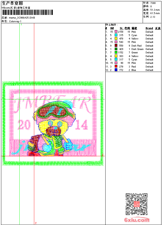 - emb花版参数: 大小:75.50 KB / 尺寸:62*51[毫米] / 针数:7388针 / 线色:8 / 格式:emb / 版本:9