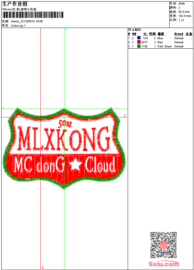 - emb花版参数: 大小:64.00 KB / 尺寸:102*68[毫米] / 针数:9545针 / 线色:3 / 格式:emb / 版本:9