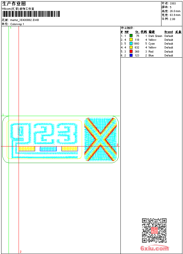 - emb花版参数: 大小:31.00 KB / 尺寸:64*26[毫米] / 针数:3303针 / 线色:5 / 格式:emb / 版本:9