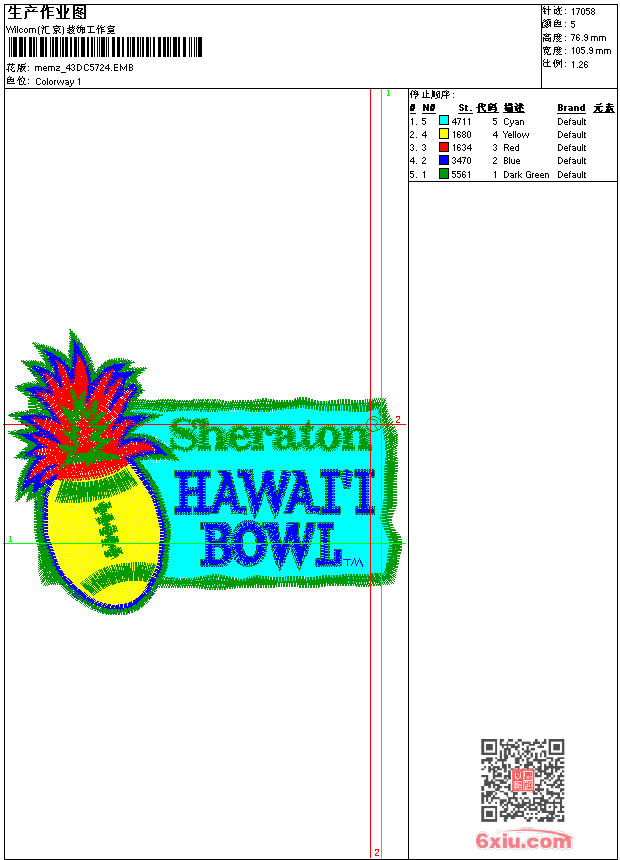 - emb花版参数: 大小:78.50 KB / 尺寸:106*77[毫米] / 针数:17058针 / 线色:5 / 格式:emb / 版本:9